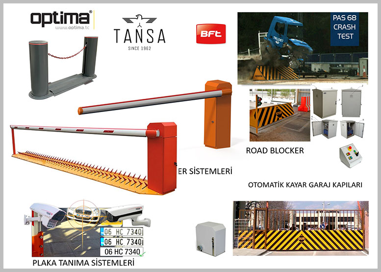 Kontrollü ve güvenli geçiş sağlamak amacıyla resmi kurum, özel işletmeler ve sitelerin ihtiyacı olan ROAD BLOCKER – BARİYER – KAYAR KAPI – PLAKA TANIMA ve ARAÇ ALTI TARAMA sistemleri bünyemizde bulunan markalar ve ihtiyaca uygun markların tedariki ile sorunsuz olarak yapılmaktadır.